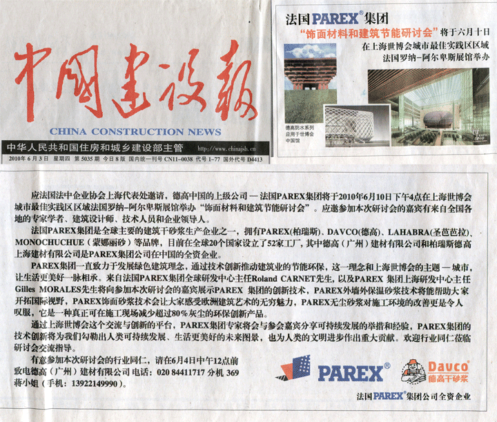 《中國建設報》報導PAREX集團飾面材料和建筑節能研討會