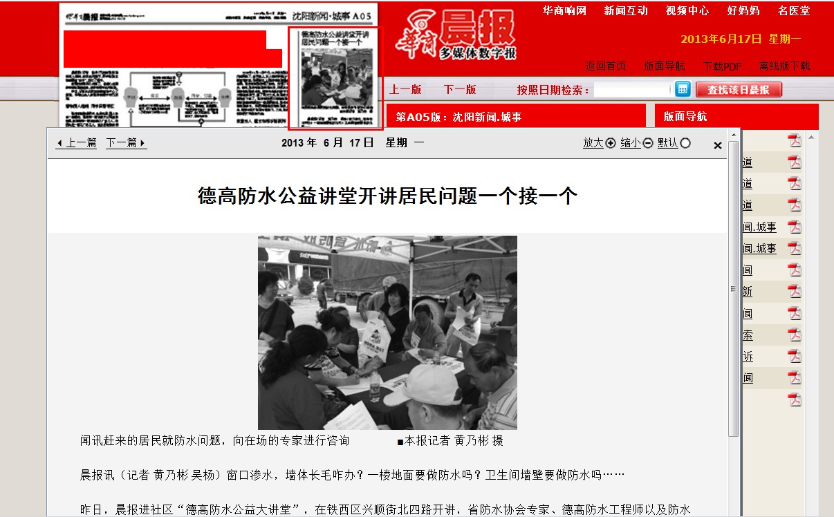 昨日,晨報進社區“德高防水公益大講堂”,在鐵西區興順街北四路開講,省防水協會專家、德高防水工程師以及防水施工隊負責人來到現場,為居民解答防水問題,居民問題一個接一個,“零距離”接受專家指導。