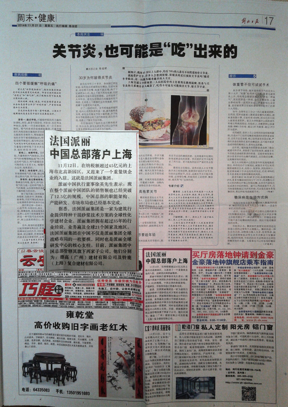 解放日報刊登派麗中國總部(上海)開業新聞