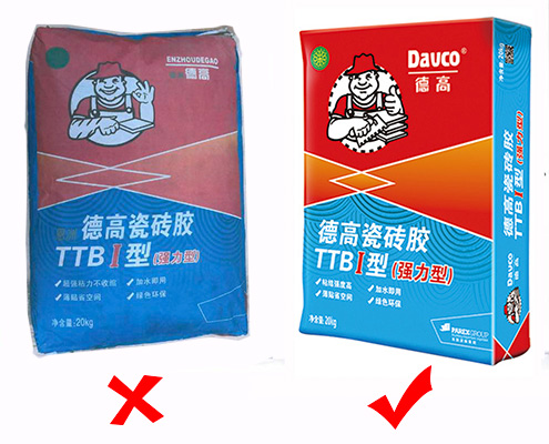 市場上推薦德高瓷磚膠的人比較多,但如果單單沖著“德高”兩個字去買,就很容易被一些不良商家以“金裝德高”、“德高王”、“恩州德高”等等非德高正品的產品套路進去。這些產品往往有著與德高產品極為相似的包裝,但其實跟我們沒有任何關系,屬于假冒產品。