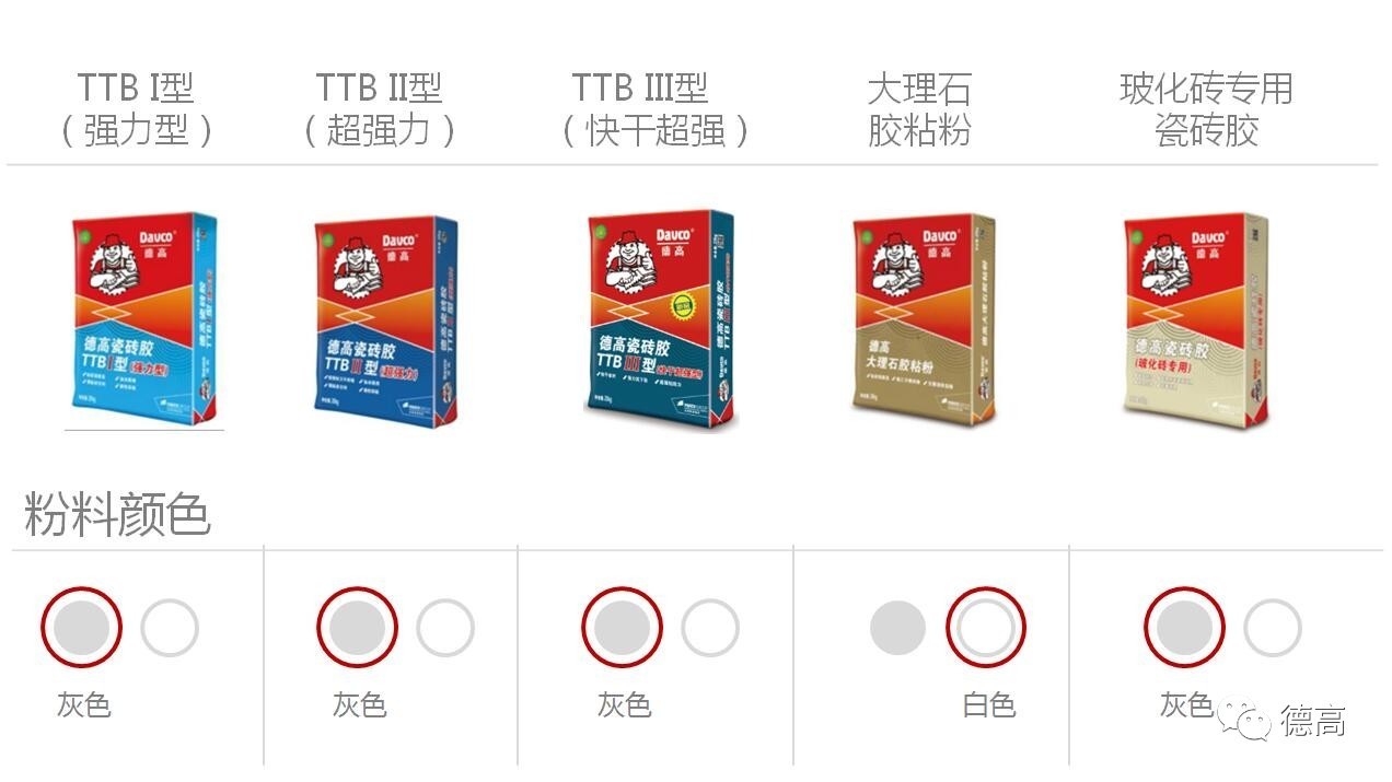 選擇瓷磚膠還要關注該品牌的解決方案是否完善。一般消費者對瓷磚的種類了解不多,挑選時只看重瓷磚的顏值。其實貼不同種類的瓷磚對粘貼材料有不同的要求。瓷磚膠不存在“萬能藥”,有責任的品牌會根據客戶的需求提供不同類型的瓷磚膠,“對癥下藥”,以專業、完整的解決方案確保“藥到病除”。如德高瓷磚膠根據粘結力、顏色、抗下墜等性能的不同推出德高TTBI、TTBII、玻化磚、大理石瓷磚膠等多個產品,完美照顧每個客戶的個性化需求。(想知道怎么才能選對最適合自己的瓷磚膠,可參考《瓷磚膠種類那么多,怎么選才最經濟實惠》)