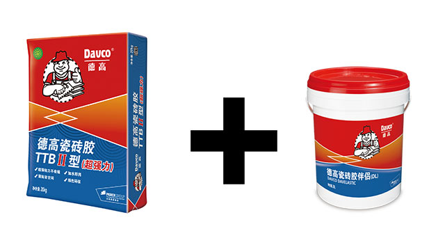 4、調料,瓷磚膠伴侶DL添加劑按照1:1比例兌水稀釋,然后按照1:4比例加德高瓷磚膠TTB II型(超強力)攪拌均勻。