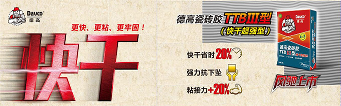 針對師傅和業主反映瓷磚膠干得慢的問題, 2016年德高成功研發并率先推出了德高瓷磚膠TTBIII(快干超強型)。這款新品,貼磚快干省時20%,粘接力提升20%,超強抗下墜,一貼快速牢固,師傅省心,業主放心!