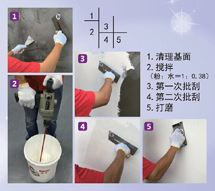 內墻膩子的施工步驟可簡要歸納為:清理基面->潤濕基面->批刮膩子(第一遍)->批刮膩子(第二遍)->打磨->清灰。下圖為簡要的施工過程。