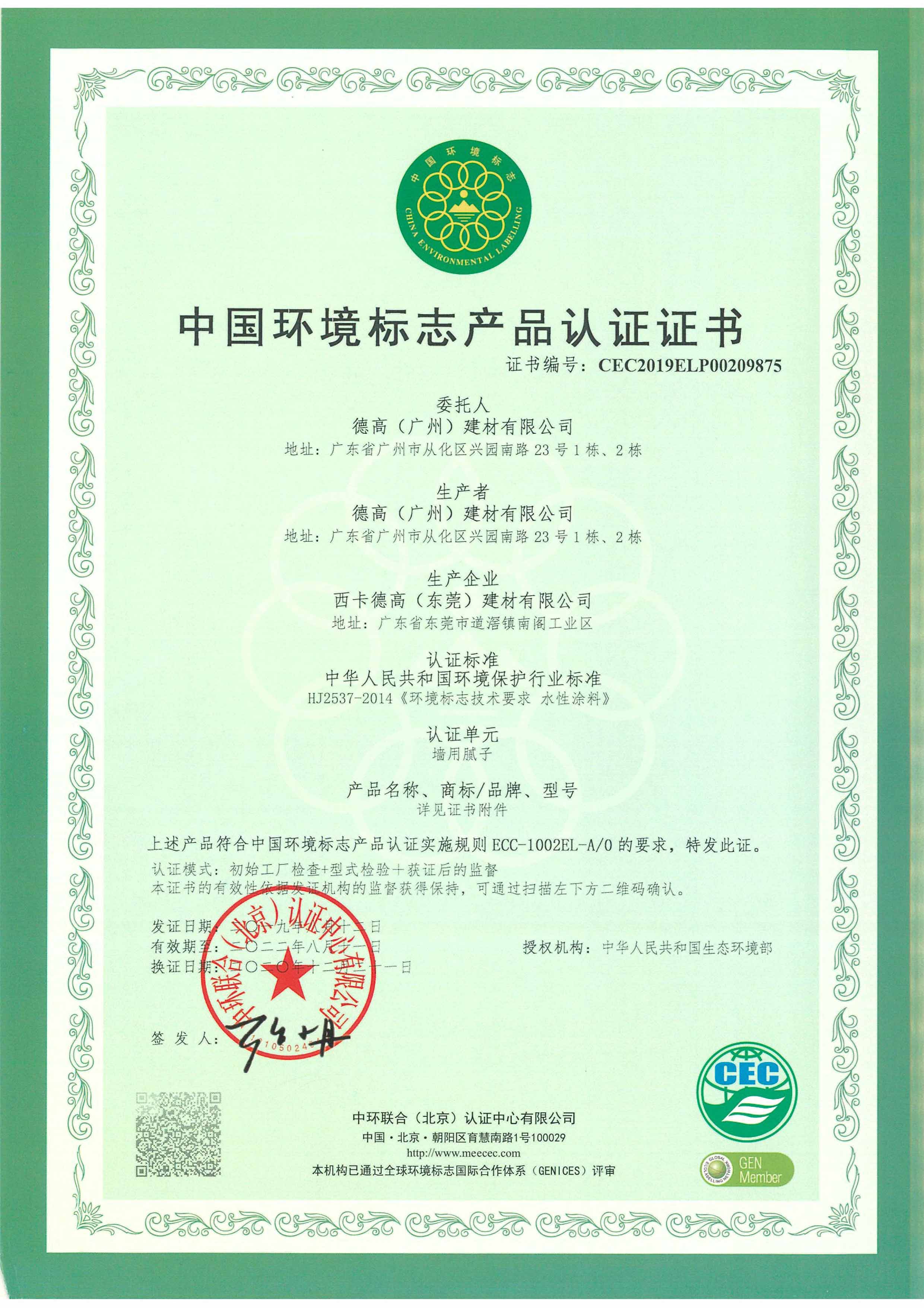 【概要描述】十環證書-東莞工廠-墻用膩子