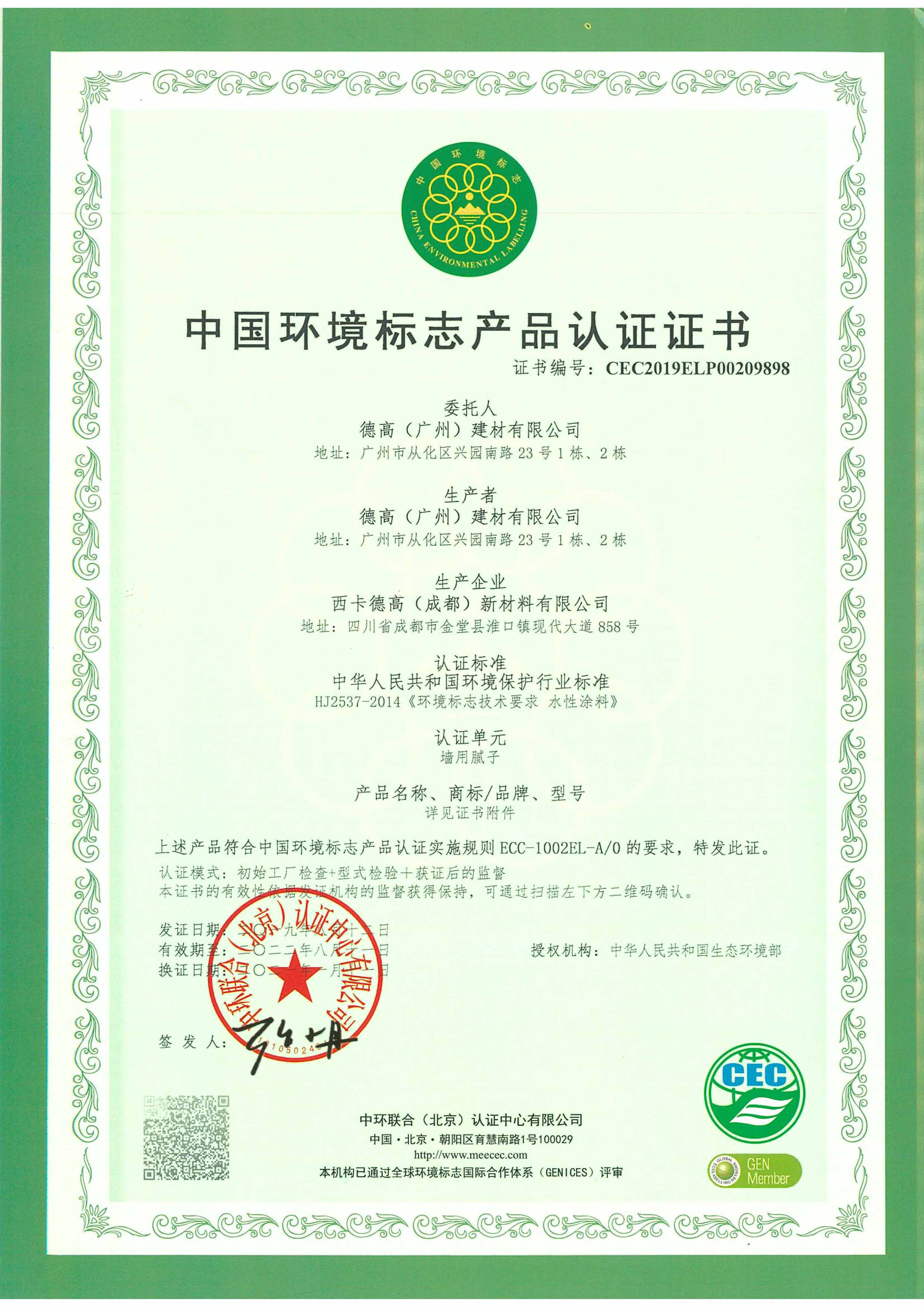 【概要描述】十環證書-成都工廠-墻用膩子