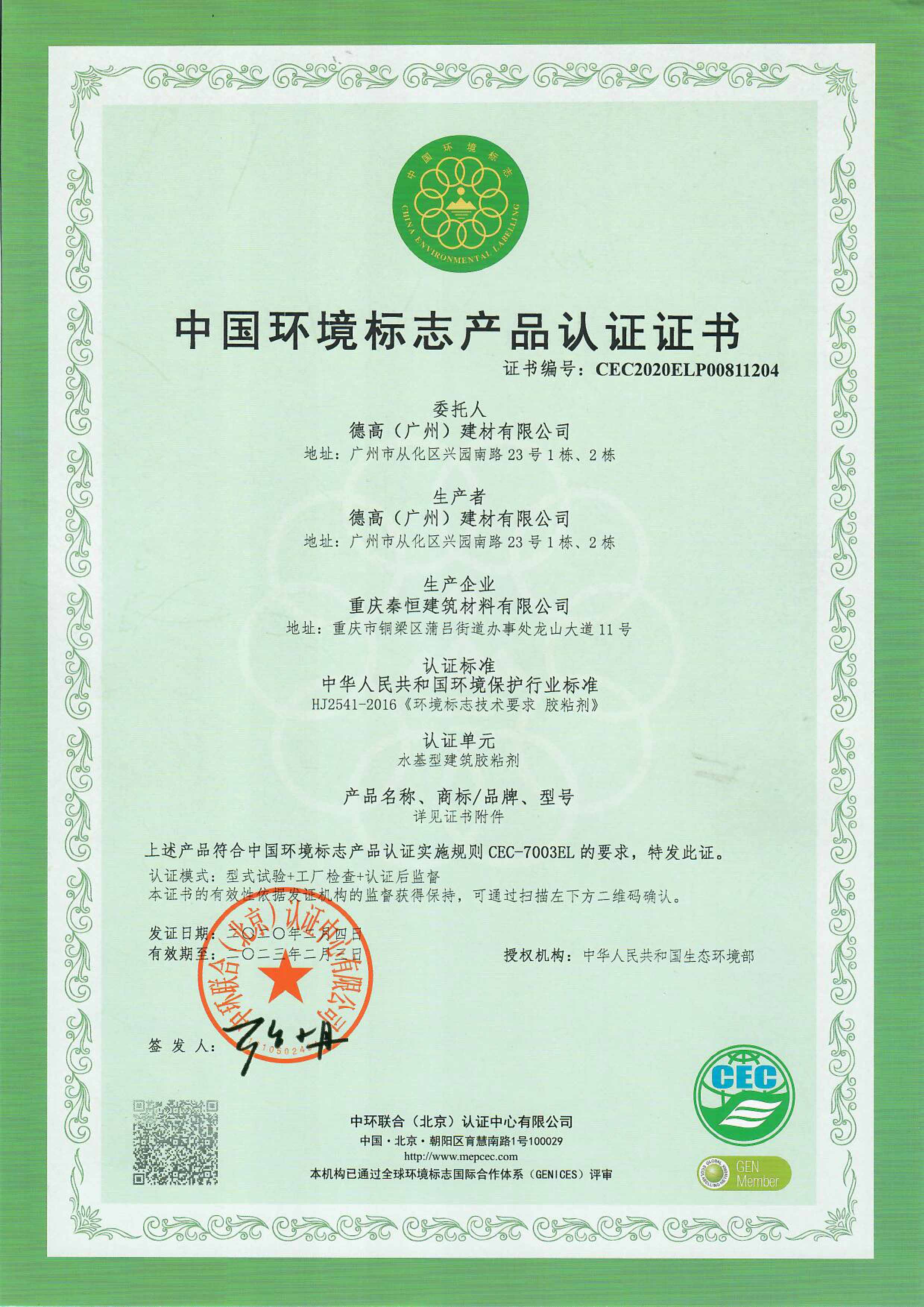 【概要描述】十環證書-重慶工廠-膠粘劑-2020